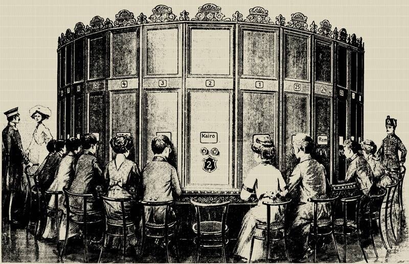 As panorama technologies advanced, their design became more sophisticated. The Kaiserpanorama was a large circular box with 25 peepholes for viewing the rotating stereoscopic glass slides.